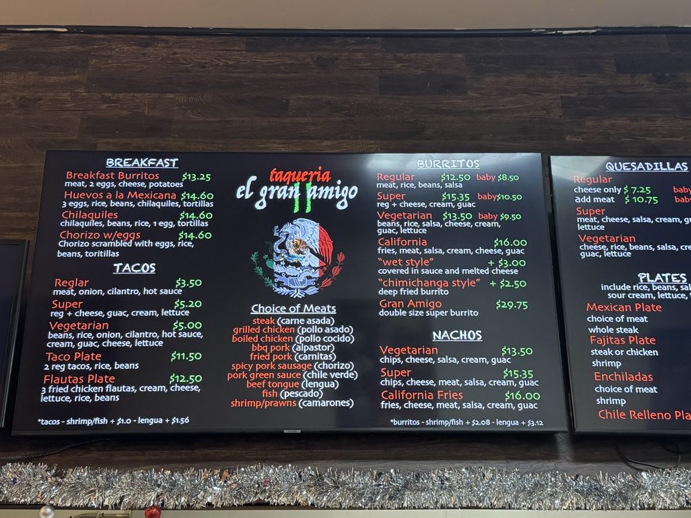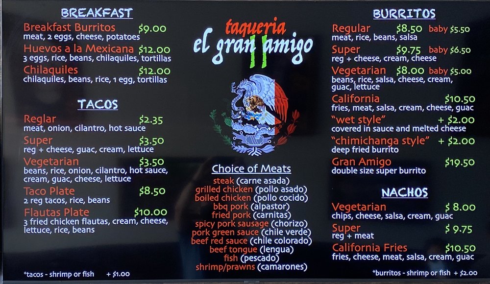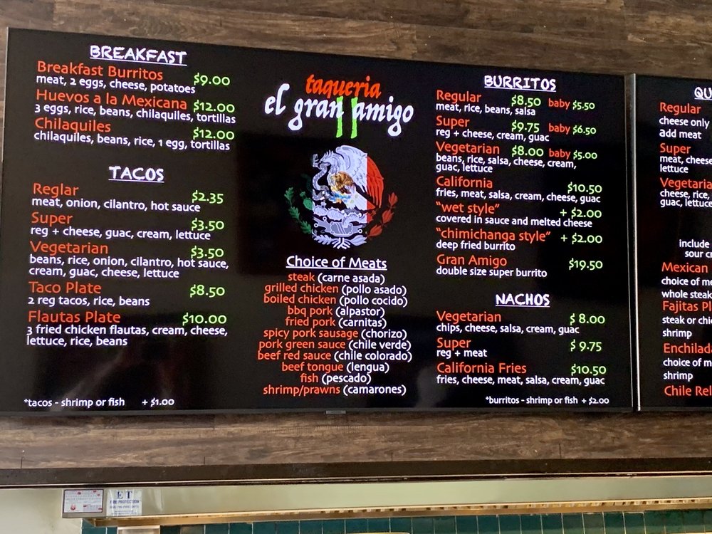 Taqueria El Gran Amigo II in Pacifica, CA, offers a variety of Mexican dishes like tacos, burritos, and nachos. Known for its prompt service and generous portions, this no-frills spot is perfect for a quick and satisfying meal. The vegetarian options are plentiful, and the meat options are flavorful. Customers praise the chicken enchiladas, pozole, and fish tacos with fresh salsa, cilantro, and onions. The California burrito and Gran Amigo burrito are top picks for those with a hearty appetite. While some wish for better guacamole, the overall experience at Taqueria El Gran Amigo II is solid. With indoor and outdoor seating, it's a great spot for families and groups. Don't forget to try their horchata and admire the art on the walls while enjoying your meal.